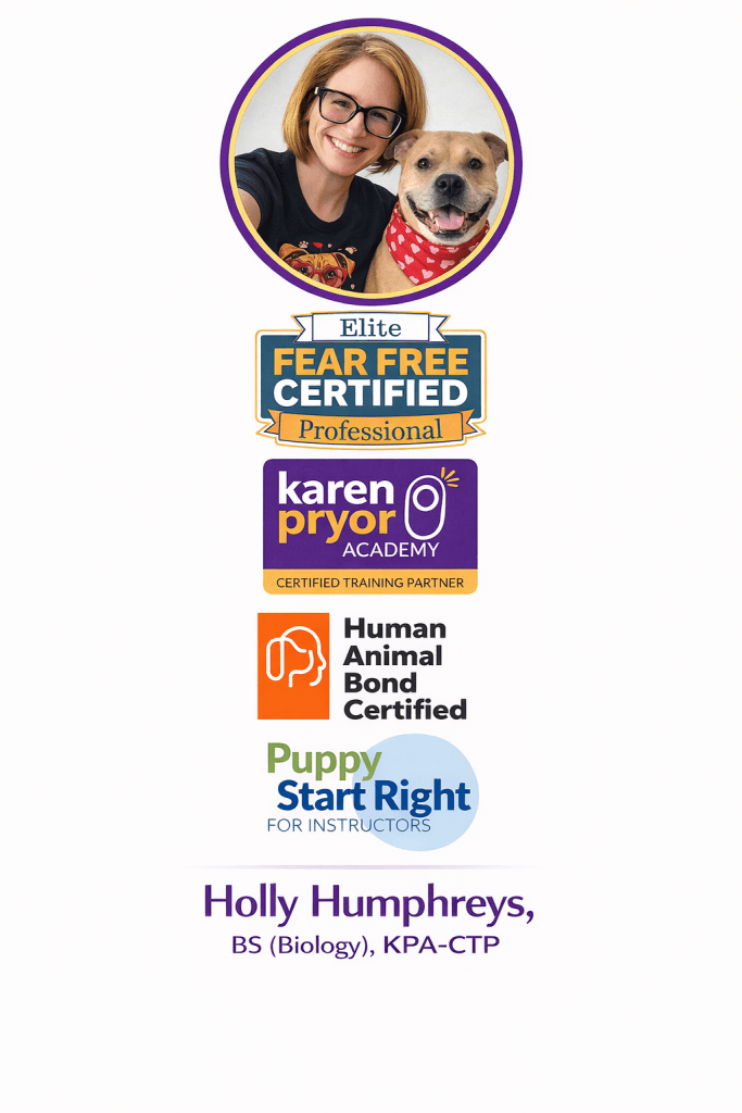 My name is Holly Humphreys and I’m the founder of Always Stay Pawsitive Dog Training. I’m dedicated to helping dogs and their families succeed through positive, science-based training methods. My professional credentials include: Bachelor’s degree in Biology (BS), Karen Pryor Academy Certified Training Partner (KPA-CTP), Elite Fear Free Certified Professional, Human–Animal Bond (HAB) Certified Professional, and a Puppy Start Right Instructor.